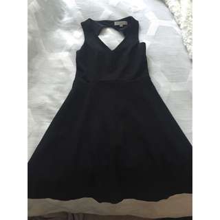 A black dress with a V-neckline and a flared skirt is laid out on a bed with a white and grey patterned blanket. The dress has a tag attached to the neckline. | LOFT Dress | 3d625f4766138b75c7f82e5c3174df2ce29fafacb15728dc8c85246e42dbde1a | 001229748788 | 0 | 0 | 32 | 2 | 0 | 0 | |