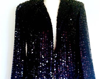 A black, sequined, long-sleeved jacket with a V-neckline is displayed on a mannequin against a white background. The jacket has a fitted silhouette and is adorned with numerous small, shiny sequins that cover the entire garment, giving it a luxurious and eye-catching appearance. | Black Sequined Jacket | 1f66cdc9321c15842bd77c93ca455107d16b1201f5b274827110c2dc58260164 | 001229748544 | 0 | 0 | 43 | 3 | 0 | 0 | |