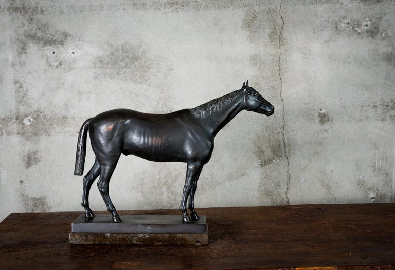 A metallic sculpture of a horse stands on a wooden table against a textured wall. | Bronze Horse Sculpture by H. Schievelkamp In Excellent Condition For Sale In Los Angeles, CA | 09c2170330ac71801ca3fd6d0fb26d2f66fcd51b923bc8881c6526f39be91e00 | 001229749227 | 0 | 0 | 15 | 15 | 0 | 0 | |