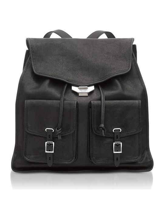 A black leather satchel with a front flap, two side pockets, and a top handle is displayed against a white background. | Rag & Bone Black Leather Field Backpack | fcc63dc2b894a4d62e74906df581738e6948f16b80ef6e1df781166a3d6dad43 | 001229749232 | 0 | 0 | 21 | 7 | 0 | 0 | |