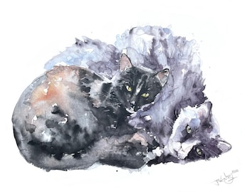 A watercolor painting of two cats, one black and one gray, curled up together. The black cat is on the left, with a white patch on its chest, and the gray cat is on the right. Both cats have yellow eyes and are surrounded by a blue and purple background with white splatters. | Cat Art, Cats, Cat Lovers Gift, Artwork, Watercolor Print, Cats, Art Print, Cat Watercolor | 0b263323d3a2a1ffe09ac6463e538b7c66db39bdae674df858b23008e4fcfca2 | 001229749051 | 0 | 0 | 53 | 14 | 0 | 0 | |