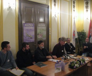 A group of men is seated at a long table in a room with yellow walls. There are several posters on the wall, including one with the word 'KAKOVA' in large letters. The men are engaged in a discussion, with some holding papers and a microphone in front of them. There is a potted plant to the right of the table, and a flag is visible in the background. | Festival aforizama u Ka\xc4\x8darevu | aca252e7877c53f77ed361039bde5f6b92bbb554a91e7cb4585d2bd9672289d4 | 001229749109 | 0 | 0 | 69 | 4 | 0 | 0 | |