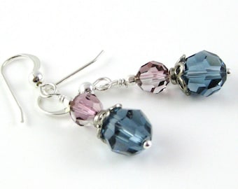 A pair of earrings with a silver hook and a blue gemstone at the bottom. The earrings have a gradient of colors, starting with a light pink at the top, transitioning to a purple in the middle, and ending with a blue at the bottom. | Tres Jolie antique pink and denim blue Swarovski sterling silver earrings | 584720f1496a8baff2650397d02748baa757c4a514cfdddf31bb0f07270b3bb4 | 001229749512 | 0 | 0 | 45 | 11 | 0 | 0 | |