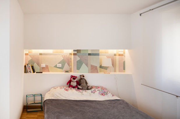 A small, tidy bedroom with white walls and a simple design. The room features a bed with a gray blanket and a floral pillow, a small shelf with a few books and a teddy bear, and a green metal chair. The walls are adorned with a colorful geometric pattern, and there is a window on the right side of the room. | Moderno Bambini by AMT studio | 51e5cbf41529858c3e2e0494a9d7cffa7b941a38cf69684c9a0d23db6e519b7d | 001229749551 | 0 | 0 | 61 | 5 | 0 | 0 | |
