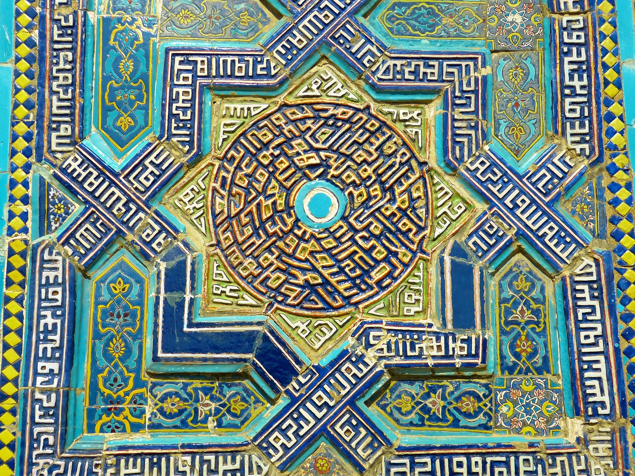 A detailed mosaic artwork with intricate patterns and designs, featuring a central circular motif surrounded by a variety of geometric shapes and Arabic calligraphy. The mosaic is composed of numerous small, colorful tiles arranged in a complex and symmetrical layout. The artwork is rich in color, with a predominance of blues, golds, and other hues, creating a visually striking and ornate piece. | Tile work, Uzbekitan | e8495726c7e628aab9ccd5682d15bd9ca29227d99f77843f6a80f07f34b4b1d2 | 001229749488 | 0 | 0 | 62 | 3 | 0 | 0 | |
