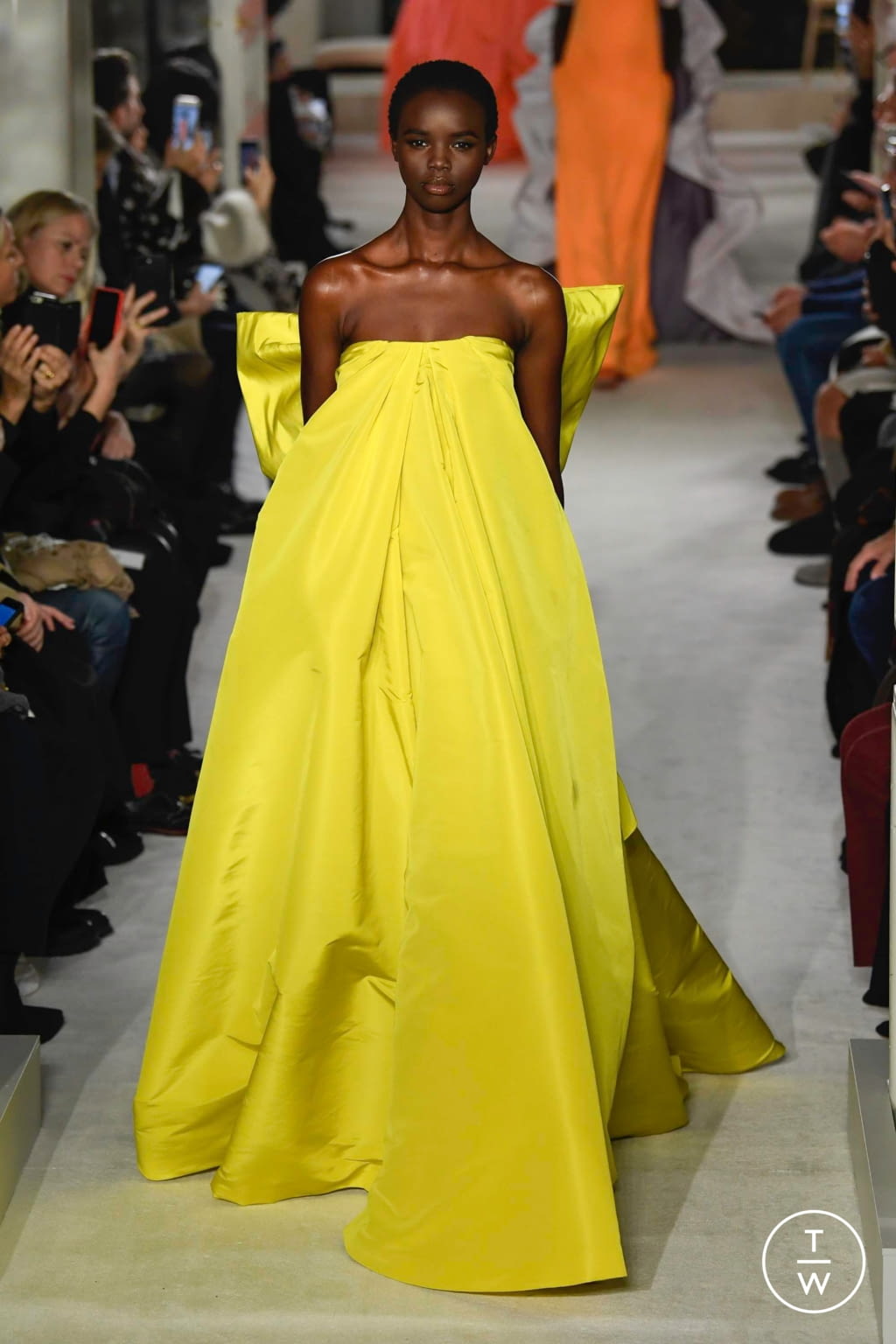 A young African woman is walking down a runway in a bright yellow dress with a flowing train, surrounded by an audience in a fashion show setting. | Fashion Week Paris Spring/Summer 2019 look 56 from the Valentino collection couture | a31e99f53b8f6552486c6a3e1cc7f32480081d13b41e0538b915913e891a6eed | 001229720432 | 0 | 0 | 27 | 12 | 0 | 0 | |