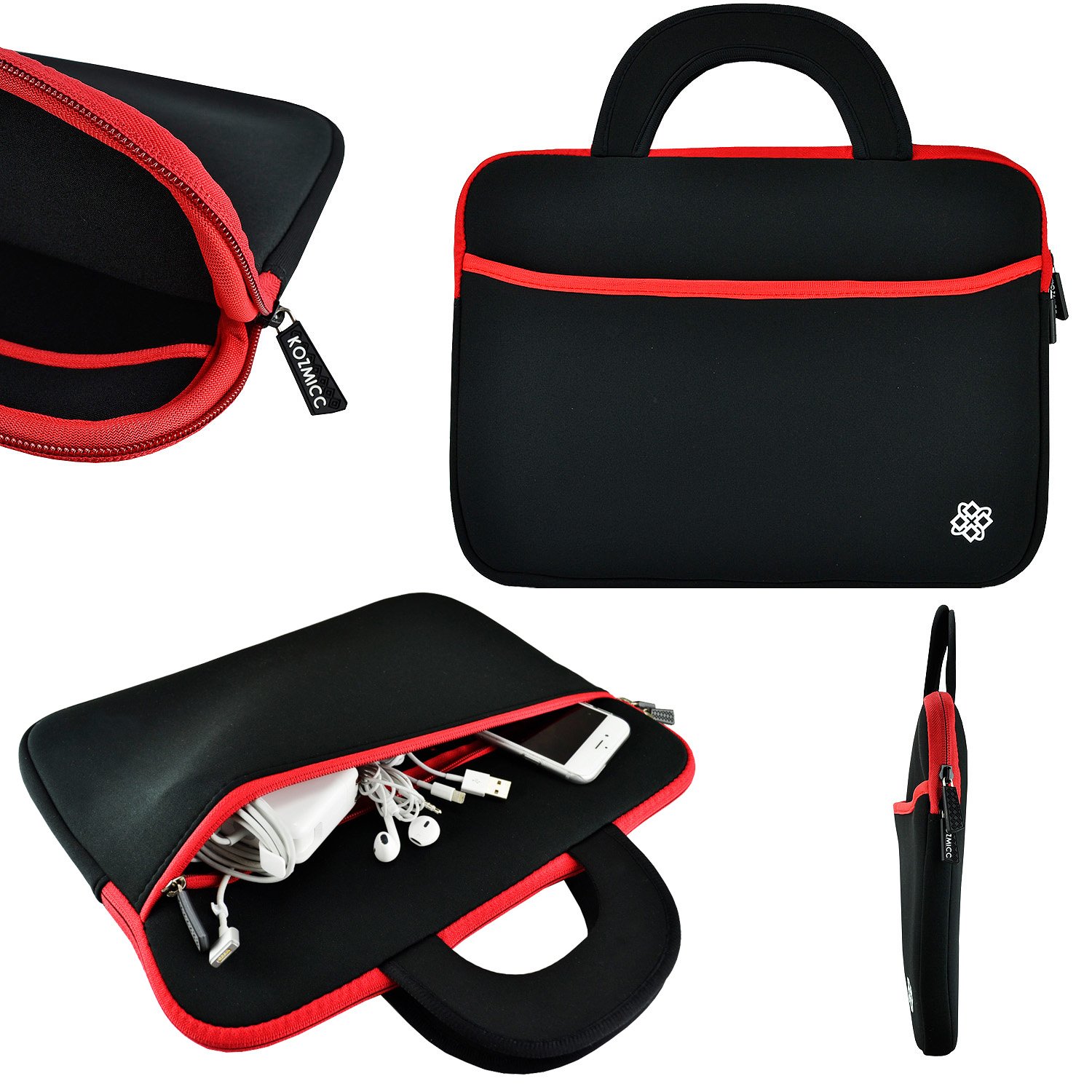 A black and red laptop sleeve with a zipper closure is displayed in a product showcase. The sleeve has a red trim and a small logo on the front. Inside the sleeve, there is a black and red smartphone case with a red trim and a small logo on the back. The smartphone case has a white charging cable and a pair of white earbuds with a white charging case inside it. | KOZMICC Black/Red Neoprene Sleeve Case with Handle for 13'' - 13.3'' Inch Laptop, Ultrabook, & the 13'' - 13.3'' Inch Apple Macbook Pro / Air | 81e31a15996002244aaac357534e3125cf7c52ec6ff6e2284c2e5242f42b44c5 | 001229720448 | 0 | 0 | 72 | 25 | 0 | 0 | |