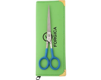 A pair of blue scissors with a black handle is displayed on a green background. The scissors are positioned vertically with the blades closed. Below the scissors, there is a green fabric pouch with a yellow trim, and the word 'FORGICA' is written in white on the pouch. | Professional Salon Shears Hairdressing Scissors Barber Shears | 5b29c2398acf553dc4d45682e03f8281d978a2bae2e0cac53462389692c65ceb | 001229720526 | 0 | 0 | 48 | 7 | 0 | 0 | |