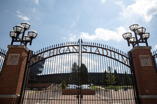 A large, ornate gate with a sign that reads 'MICHIGAN STADIUM' is set against a backdrop of a clear blue sky. The gate is flanked by two brick pillars with decorative lamp posts on top. The stadium itself is visible in the background, with a large tree in the foreground to the left of the gate. | A view outside of Michigan Stadium on the University of Michigan campus amid reports of college football cancellation in Ann Arbor | a58bab98ecd2232f81cf93815c144dce02b74bfb2b7dcf3a72bfd28bdb192f79 | 001229720580 | 0 | 0 | 56 | 21 | 0 | 0 | |
