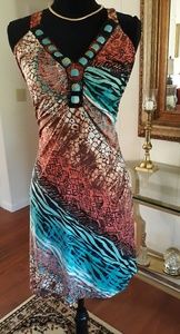 A mannequin is dressed in a colorful, patterned dress with a V-neckline and a flared skirt. The dress features a mix of blue, orange, and brown hues, with intricate patterns that give it a unique and eye-catching design. The mannequin is positioned in a room with wooden flooring, and there is a mirror in the background reflecting the room's interior. | \xf0\x9f\xa7\xa1\xf0\x9f\x92\x99Nwot,Venus Dress\xf0\x9f\x92\x99\xf0\x9f\xa7\xa1 | 6af0726c2c22ff886deac13866bf5b1614c5ba3b5482981e7cc7f7458a19f8a3 | 001229720676 | 0 | 0 | 60 | 2 | 0 | 0 | |