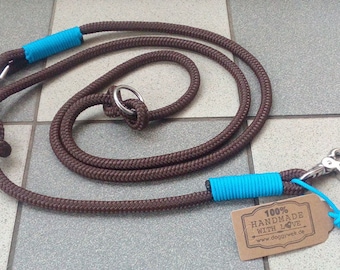 A coiled brown leather leash with blue handles and a tag that reads '100% Handmade with Love' is lying on a tiled floor. | Dog leash TAU - multi adjustable with brass | 2c7c8fdbe147d10335d1de7efd2031310eafc44dce31d5a0f2f86de1f513e6e2 | 001229720546 | 0 | 0 | 23 | 8 | 0 | 0 | |