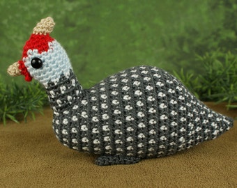 A crocheted plush toy of a chicken with a red and white head, a black and white body, and a grey tail is sitting on a brown surface with a green background. | PDF Guinea Fowl amigurumi CROCHET PATTERN | 189dab03392321367aa8a638678f2c9c7edde5ad00841659dc1e7bce43182a9a | 001229720510 | 0 | 0 | 32 | 6 | 0 | 0 | |