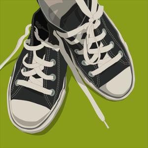 A pair of black and white sneakers with white laces is placed on a green surface. The sneakers are positioned with the toe pointing to the left and the heel pointing to the right. The laces are untied and spread out in a fan-like shape, with the ends of the laces pointing upwards. | Lowtops (black on green) by John W. Golden | fb7146d3424b51885aec3bb4125cfbec78e72d271cc1f80e20f991c7603448a8 | 001229720594 | 0 | 0 | 53 | 8 | 0 | 0 | |