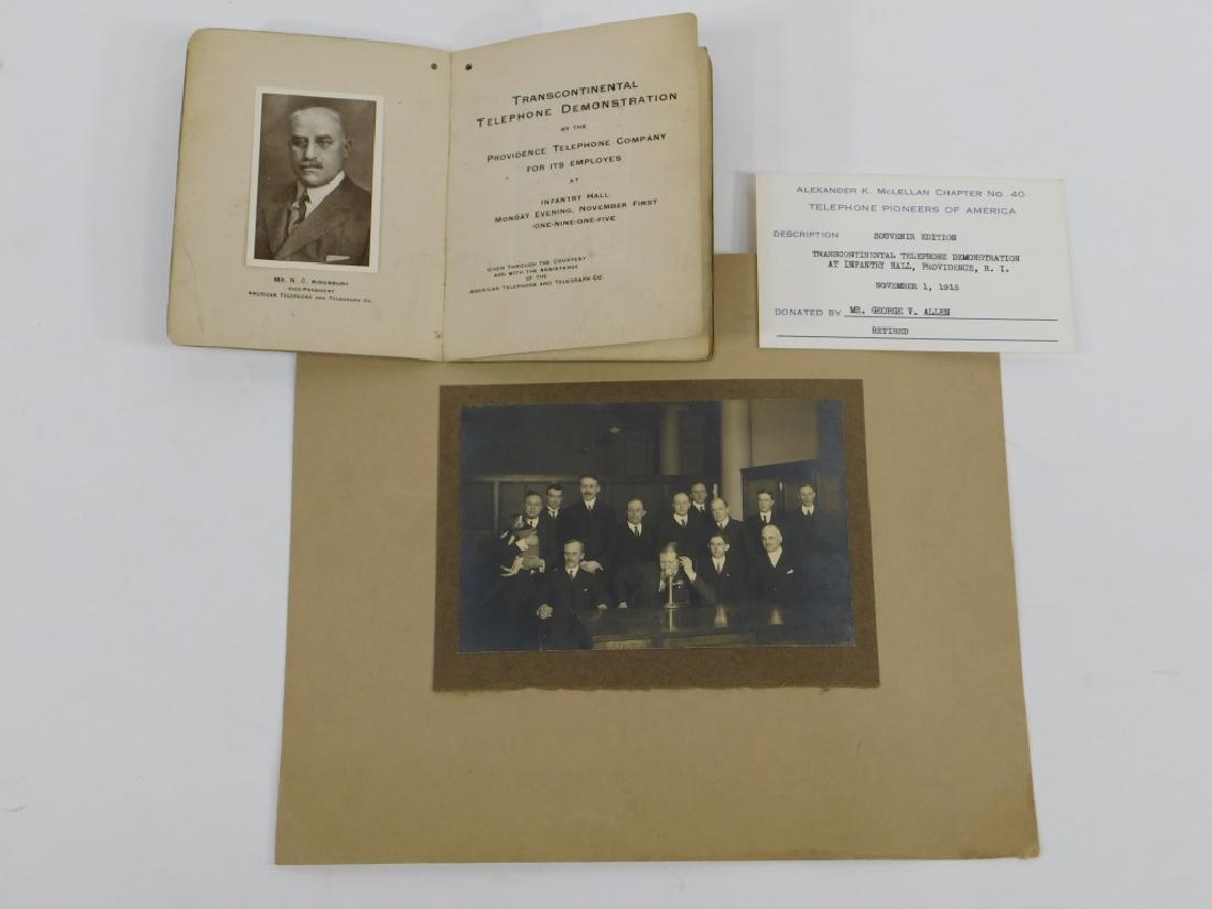 A vintage photograph of a group of men in suits and ties, with a man in the center holding a trophy, is displayed on a brown cardboard frame. The photograph is accompanied by a book with a title that reads 'TELEFONICZNA KOMUNIKACJA' and a smaller card with text in a foreign language. The items are placed on a white surface. | C.1915 Transcontinental Telephone Demo Photograph | 1f6f8dd3da4f088aecf5e1a10585d56d8f6a0cf274de364928ef2010baed750d | 001229720601 | 0 | 0 | 60 | 5 | 0 | 0 | |