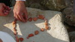 A person's hand is placing a small, round, brown object onto a flat surface, which appears to be a stone or a plate. The object is being placed in a specific pattern, and there are several other similar objects already on the surface. The scene is outdoors, and the lighting suggests it is either early morning or late afternoon. | Couple playing with stones and forming a heart of them | 0e7a59a42bb39ece187b1a2723d75d625d23c0744bafa75f9290c375e26da169 | 001229720721 | 0 | 0 | 59 | 10 | 0 | 0 | |