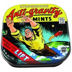 A vintage-style tin can with a cartoon character on the front. The character is depicted in a dynamic pose, with one arm extended upwards and the other downwards, as if he is flying through space. The character is wearing a yellow shirt, brown pants, and glasses. The background features a space scene with stars, a planet, and a rocket. The tin can has a red and blue 'LIFT' label on the bottom and a barcode on the top right corner. | Mints Anti Gravity | 523d6b6ed461f2f8840a1ff581a09c0edd0fdfaec29e64a20e704558c9f77911 | 001229720744 | 0 | 0 | 80 | 3 | 0 | 0 | |