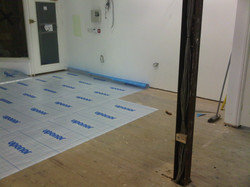 A room with a wooden floor covered in blue protective plastic sheets. There is a wooden beam in the center of the room, and a broom is leaning against the wall to the right. The walls are white, and there is a door on the left side of the room. The ceiling is not visible, and there is a small electrical outlet on the wall. | Under Floor Heating | be0baf25b70bbd566242f984139ccd868f7fb65bc9922bb6ddea29dff313c1c1 | 001229720697 | 0 | 0 | 65 | 3 | 0 | 0 | |