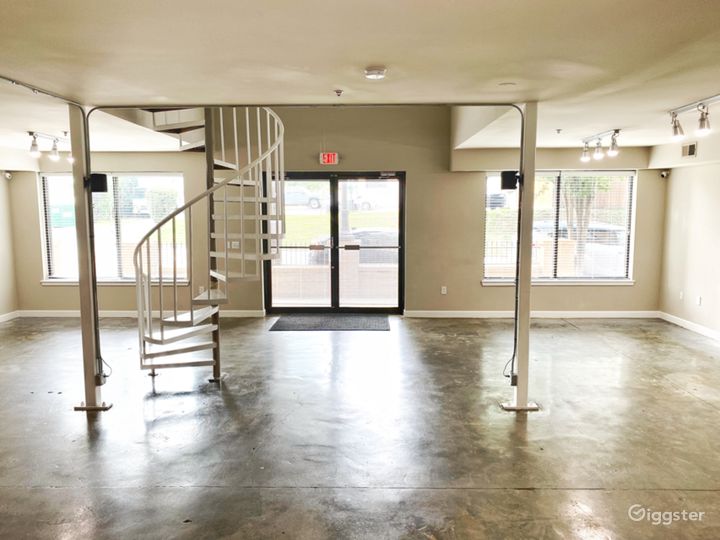 A spacious room with a large spiral staircase in the center, surrounded by a concrete floor. The room has a high ceiling with a single light fixture hanging from it. There are two large windows on the right side, and a door with a window on the left side. The walls are painted in a light beige color, and there are two speakers mounted on the wall. The room appears to be empty and well-lit. | Convenient Buckhead Event Studio Photo 5 | 5e309a4870520c435cca9d2eee559c8c6d487d5fa44560964a86580fb2c07aa5 | 001229720853 | 0 | 0 | 75 | 6 | 0 | 0 | |