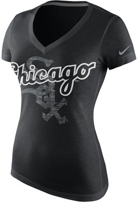 A black t-shirt with a white Nike swoosh logo on the right side and a white 'CHICAGO' text with a stylized 'C' and 'X' design on the front. The shirt has a V-neckline and is modeled on a mannequin. | Nike Women's Short-Sleeve Chicago White Sox V-Neck T-Shirt | aaabde7eb7a507a3e51eabb4f68e348a0fc751d6478cd17a6d2724de17ed7fa3 | 001229721007 | 0 | 0 | 39 | 8 | 0 | 0 | |