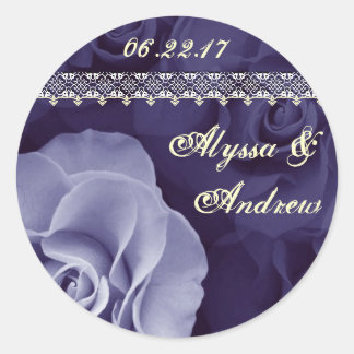 A circular image with a purple background featuring a floral pattern. In the center, there is a large, detailed rose with a gradient of purple to blue hues. Above the rose, there is a date '06/22/2017' in a decorative font. Below the rose, the names 'Alyssa' and 'Andrew' are written in a cursive script, with 'Alyssa' on the left and 'Andrew' on the right. The names are also in a gradient of purple to blue hues, matching the rose. | PERIWINKLE Rose Bride & Groom Wedding Sticker | 87813824727e175ed1c31f2f1b740d898ce1a115afebac4401a4e7ff11c611b8 | 001229721031 | 0 | 0 | 79 | 7 | 0 | 0 | |