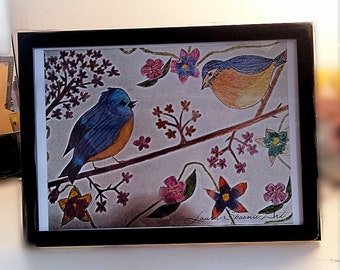 A framed picture of a bluebird perched on a branch with a yellow bird sitting next to it. The birds are surrounded by colorful flowers and leaves. The frame is black, and the picture is hanging on a wall. | PRETTY Birds - A4 Matte Print | 51ed974d59388cef13c0589feabdf0960a8656ceb287823982c3a0a45216e186 | 001229721274 | 0 | 0 | 39 | 6 | 0 | 0 | |