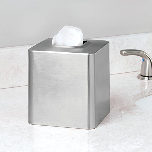 A silver tissue box with a white tissue sticking out is placed on a marble countertop. | Large Product Image of mDesign Facial Tissue Box Cover/Holder for Bathroom Vanity Countertops - Pack of 2, Brushed Stainless Steel | aaf8dcaa4e1b5ca1e4ee6f1756e48690990d5b01ce653141ee6d92960584004c | 001229721268 | 0 | 0 | 16 | 20 | 0 | 0 | |