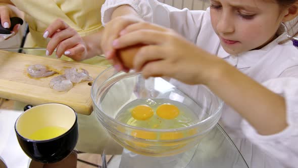 A young girl is cracking eggs into a clear glass bowl on a kitchen counter. She is wearing a white shirt and is focused on the task. There are two eggs in the bowl, and a wooden cutting board with eggshells is also on the counter. A yellow cup with a spoon is visible to the left of the bowl, and another person's hand is partially visible in the background. | Little Helper Cooking with Mother, Girl Breaks Eggs Into Bowl. Simple Kids Meals | 07adbb9ade65dff7e899c718ed36151ff3c8f47444a33ff17beaf4c5f84f3c50 | 001229721298 | 0 | 0 | 70 | 13 | 0 | 0 | |
