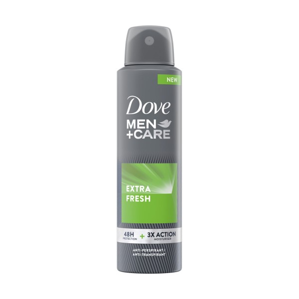 A bottle of Dove Men+Care Extra Fresh deodorant with a grey label and a green logo. The label has the words 'Dove Men+Care' and 'Extra Fresh' in white, along with a green and white logo. The bottle has a black cap and is placed against a white background. | DOVE MEN CARE DEODORANTE EXTRA FRESH 48 H + 3 X ACTION SPRAY 150 ML, DEODORANTI ANTIODORE PER PERSONA, S168389, 99642 | 0ae843642f7450de1a93bc25d982b35e32a8271fe1ec2040592bf2138b07ab71 | 001229722038 | 0 | 0 | 48 | 21 | 0 | 0 | |