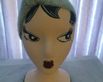A mannequin head with a green knitted hat is placed on a white surface. The mannequin has a stylized face with exaggerated features, including large eyes, a prominent nose, and a wide mouth with a red lip. The head is positioned with the face looking slightly to the left. | Hand knitted womans headband | 3cba24e61d4a8f5b086b1a2cbe633f6b8026908441c96005f0859121e464bbd1 | 001229722093 | 0 | 0 | 49 | 4 | 0 | 0 | |