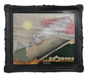 A textured, aged canvas with a painting of a landscape featuring a sun, a plane, and a red and white structure, all set against a backdrop of a mountainous terrain. The painting is framed within a dark, ornate picture frame with visible signs of wear and damage, including a torn corner and a missing piece of the frame. | W\xc5\x82adys\xc5\x82aw HASIOR (1928-1999), Ostatni lot Ikara, 1980 | 8c0169c449320d8dd7fa0dbc9a6ab997b64ab0d9c0aa37a2c0d0e4d6a0e79d97 | 001229722066 | 0 | 0 | 58 | 7 | 0 | 0 | |