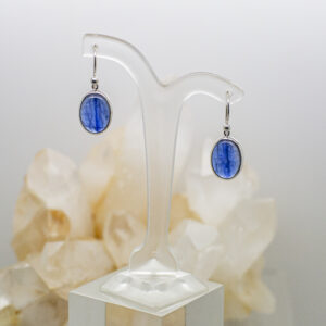 A pair of blue gemstone earrings is displayed on a clear acrylic stand. The stand has a curved, V-shaped design with a circular base. The earrings are attached to the stand by silver hooks. The background features a white surface with a collection of white crystals or small stones scattered around the base of the stand. | Kyanite Earrings (1) | a7653895edd841713268f9711914659ab94228b4c2a9acef1c6c4a577cdec699 | 001229722209 | 0 | 0 | 56 | 3 | 0 | 0 | |