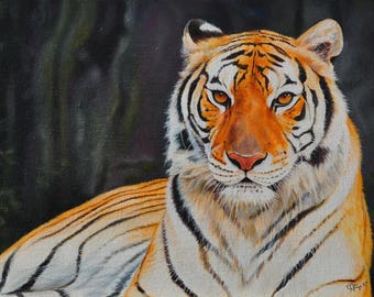 A close-up portrait of a Siberian tiger with striking orange fur and black stripes, set against a blurred background of green foliage. The tiger's eyes are open, and it appears to be looking directly at the viewer. The image has a textured, almost painted quality, with visible brush strokes and a color palette that emphasizes the tiger's vibrant orange and black hues. | Tiger Paul tiger oil painting on canvas ready to hang / hipper-realism / animal | 8c22ae1d80dce07d91ce534cb23aaa0c3c97c81252837973742bed6c5f9b24ae | 001229722262 | 0 | 0 | 62 | 14 | 0 | 0 | |