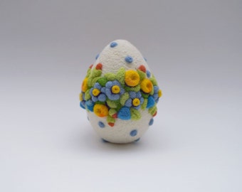 A small, white egg with a textured surface and a colorful floral pattern is placed on a white background. The egg has a blue base and is adorned with a variety of colorful flowers and leaves in shades of blue, yellow, red, and green. The flowers are arranged in a way that resembles a bouquet, with some flowers overlapping each other. | Egg Easter Gift Needle Felted Eggs Easter Egg Home Decor Flower Wreath Ornament | 8a0ac82e9446c2b3a23d3ace2e2abd69043b8ffa3991dbf4848777f18edf5bc2 | 001229722343 | 0 | 0 | 61 | 13 | 0 | 0 | |