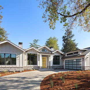 A two-story house with a gray roof and white siding is surrounded by a well-manicured lawn and a variety of trees. The house has a prominent chimney and a garage with a gray door. The front door is yellow, and there is a clear blue sky above. | Palo Alto - modern farmhouse | 45909c77000ded7b6203a6bd46309c4bdcbc3a635e31c349ea0f329fd11bfecb | 001229722353 | 0 | 0 | 47 | 5 | 0 | 0 | |