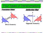 A geometric diagram illustrating four types of transformations: translation, reflection, rotation, and dilation. The diagram features a red and blue triangle with labeled points and arrows indicating the transformations. The text above the diagram reads 'Four Types of Transformations'. | Four Types of Transformations | f8f811e9b5937cdb19b7ba7d1449d29313de76dfe91879bbca8054774cba4bbf | 001229722278 | 0 | 0 | 39 | 4 | 0 | 0 | |