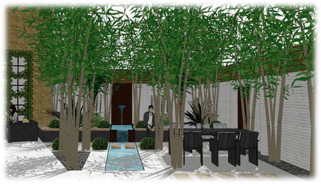 The second image shows the same interior space with a significant change in the ambiance. The room is now filled with tall, slender bamboo plants that create a dense, green canopy. The lighting is cooler, and the overall atmosphere is more natural and serene. The furniture has been updated to include a modern black chair and a bench, and the floor is now a light-colored wood. The window on the left side of the room is still present, but the view outside is not visible. The person who was present in the first image is no longer in the scene. | Water feature - Concept design - London | 1626794355c2d97eb657b7eff43303730b223ad65796f353843b9efd18aa5f3c | 001229722553 | 0 | 0 | 100 | 7 | 0 | 0 | |