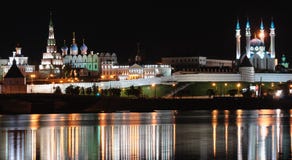 A nighttime cityscape with a large body of water in the foreground reflecting the city lights. The skyline features a prominent building with multiple spires and domes, illuminated with lights. The sky is dark, and the overall scene has a serene and reflective quality. | Kazan Kremlin by night. The magnificent Kremlin of Kazan (a Unesco World Heritage) with its orthodox church and mosque, a symbol of coexistence among different Stock Photography | 09072bd88cbf0b90276d527bcd9926603e404e4112eb1dafce590a401fdca9c0 | 001229722651 | 0 | 0 | 44 | 27 | 0 | 0 | |