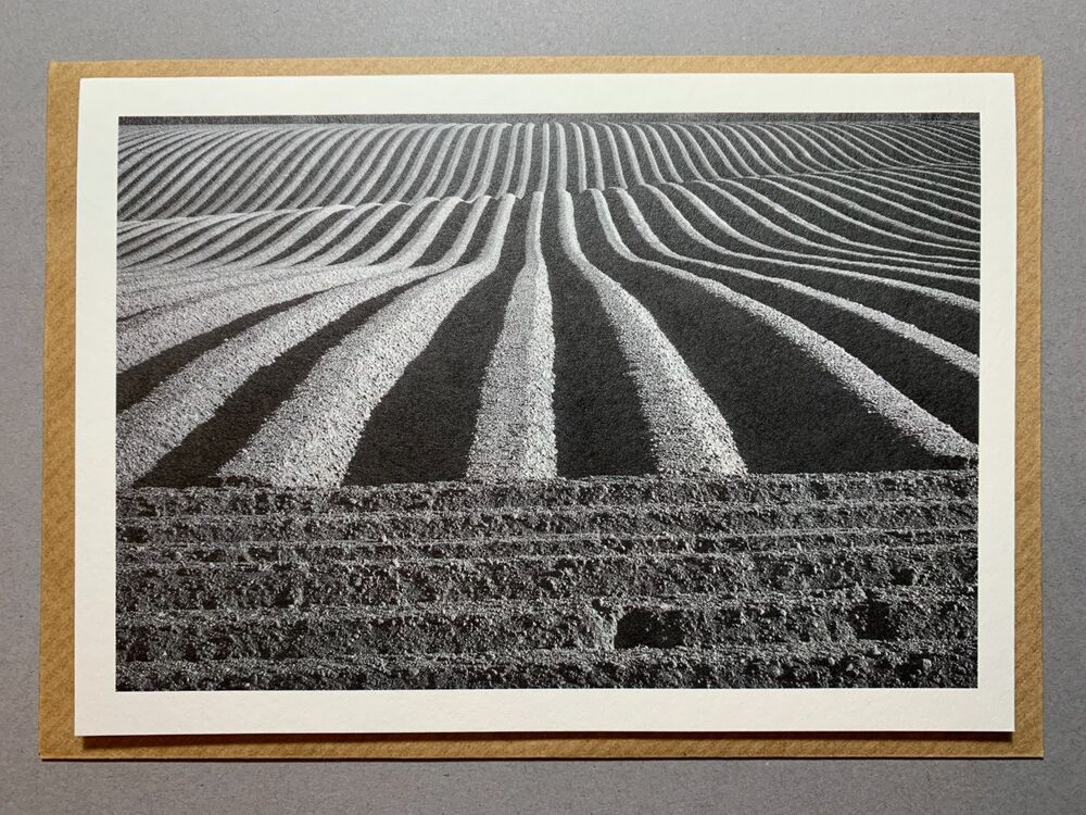 A black and white photograph of a field with parallel lines of crops, resembling a plowed field. The image is framed by a cardboard border, giving it the appearance of a picture within a picture. | Potato field, Waterloo Farm, North Yorkshire | 981c43457a9771f0619838cf4f212aaef10a7bf4585177354eba1a8a077c02e4 | 001229722889 | 0 | 0 | 35 | 6 | 0 | 0 | |