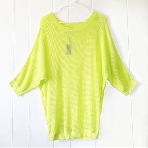 A bright yellow t-shirt with a small tag hanging from the neckline is displayed on a white hanger against a white background. | NWT Express Neon Yellow Open Knit Sweater | 5e40ed07186ae754875eaf5bdc4119cd4fba25997bb2e92b6cd5d7248a686804 | 001229723375 | 0 | 0 | 22 | 7 | 0 | 0 | |