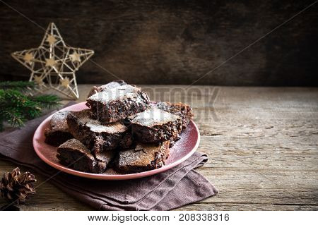 A plate of chocolate brownies is placed on a wooden surface. The brownies are stacked on top of each other, with some visible icing on the top layer. A star-shaped decoration hangs in the background, and a pine branch is partially visible on the left side of the image. The plate is on a brown cloth napkin, and the overall lighting is soft and warm. | Brownies For Christmas | f812f77f06aa546607be2f68691df003ce32bf478dc508d6c9aaa1d065426701 | 001229723353 | 0 | 0 | 65 | 3 | 0 | 0 | |