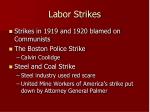 The image is a red background with white text that reads 'LABOR STRIKES' in bold font. Below this, there are four bullet points with additional text:\n\n* Strikes in 1919 and 1920 blamed on communists\n* The Boston Police Strike\n* The Calving Co. Strike\n* Steel and Coal Strike - Steel industry used red scare to put down by Attorney General Palmer\n\nThe text is centered and appears to be a list of historical labor strikes. | labor strikes | 31abab3c2d1533b852162802964ae1900c93515f9bf711070352493cd7d47a7e | 001229723167 | 0 | 0 | 72 | 2 | 0 | 0 | |