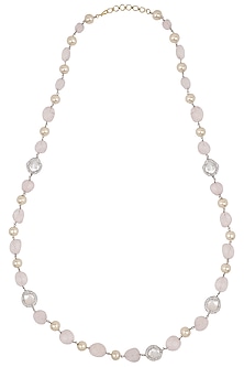 A close-up image of a necklace with a round, smooth pearl pendant and a chain composed of multiple strands of pearls and beads. The pearls are of various sizes and are predominantly white with some pinkish hues. The beads are small and round, with a metallic finish. The necklace is set against a white background, and the lighting is soft and diffused, highlighting the textures and colors of the pearls and beads. | Mother Of Pearl and Quartz Beaded Necklace by Just Shraddha | a1e3de603252b45d7c384d2b74f7ed14b3658b6824fc73751e9e91697915bdc7 | 001229723419 | 0 | 0 | 72 | 10 | 0 | 0 | |