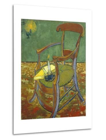 A framed painting of a wooden rocking chair with a green cushion, placed on a patterned carpet. The chair is positioned in front of a wall with a greenish hue, and there is a lit candle on the seat. The painting has a textured appearance, and the frame is white. | Gauguin's Chair-Vincent van Gogh-Metal Print | 2db52125bb265ae2d40938ae904c15965021fd1b5e4f59a91d3ad4e12617c85f | 001229723608 | 0 | 0 | 50 | 5 | 0 | 0 | |