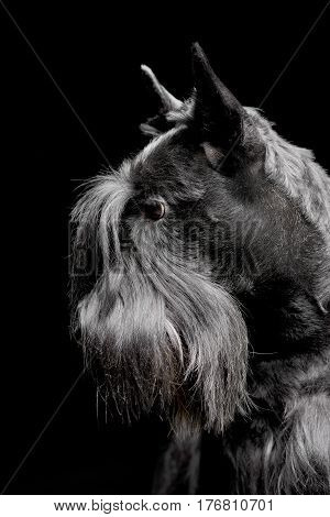A black and white image of a dog with a long, shaggy coat and a distinctive beard. The dog is looking directly at the camera with a focused expression. The background is a solid black, and the image has a vignette effect, with the corners being darker than the center. The image is labeled with a watermark at the bottom right corner, which includes the text 'BIGSTOCK' and a website URL. | Portrait Of An Adorable Scottish Terrier | 8a2484480a173fe0e692dfca2157dda6ae825bdf541f94fdd66dbe081ddbd779 | 001229723597 | 0 | 0 | 71 | 6 | 0 | 0 | |