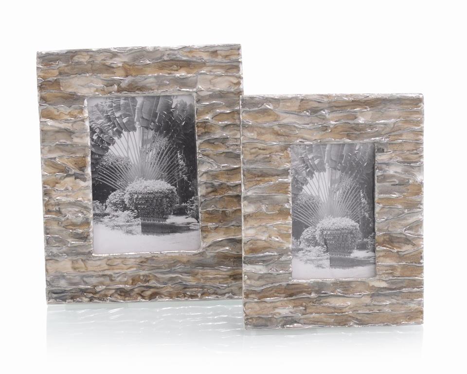 A pair of identical framed photographs with a textured stone-like border. Each frame contains a black and white image of a palm tree with a woven basket at its base, set against a backdrop of a tropical scene with a clear sky and a hint of foliage. The frames are placed side by side on a white surface, with a subtle shadow cast to the right of each frame. | Cream and Brown Enameled Photo Frames | cdac1cc8f42cf930e31772b224ad5b87b78a697eb849875a384357b974a14b78 | 001229723491 | 0 | 0 | 69 | 6 | 0 | 0 | |
