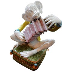 A white ceramic figurine of a monkey playing a pink and white harp, seated on a green cushion with a blue and gold border, placed on a wooden surface. | Vintage Italian Glazed Terracotta Monkey Figure | f8a1925678802714ad4e943fd42d70f893b09227888462c26d02cd5956a494f3 | 001229724364 | 0 | 0 | 29 | 6 | 0 | 0 | |