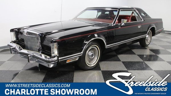 A classic car showroom with a black vintage car with a red interior and chrome details. The car is positioned on a checkered floor, and the showroom has a white wall with a logo that reads 'STREET SIDE CLASSICS CHARLOTTE SHOWROOM'. | 1979 Lincoln Continental Mark V for Sale $18,995 | b6131792741330fec3a3f1ffc79033ca60ecc1d7e028f25c2e3011c03b1f7d26 | 001229724362 | 0 | 0 | 41 | 8 | 0 | 0 | |