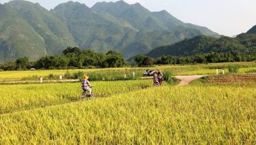 A group of people are walking through a lush green rice paddy field with mountains in the background. The field is surrounded by trees and the sky is clear. | Northern Loop Vietnam 13 Days 12 Nights | fcdfc8f66bd38344daa40879b3bacf32428641283bbc7b58d58012e0f314ad97 | 001229724382 | 0 | 0 | 29 | 7 | 0 | 0 | |