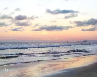 A serene beach scene at sunset with a clear sky filled with soft pink and blue hues. The sun is low on the horizon, casting a warm glow on the water. Gentle waves are lapping onto the sandy shore, and a few boats are visible in the distance on the water. The sky is adorned with fluffy clouds, and the overall atmosphere is calm and peaceful. | Beach Photography- Huntington Beach CA Sunset Photo, California Beach Print, Beach Sunset Print, Ocean Landscape, Coastal Art, Beach Decor | a56f1cab25ed659245689224d647bc3edb9925a6224ed5fa3f32b86b85ab25dd | 001229724290 | 0 | 0 | 66 | 19 | 0 | 0 | |