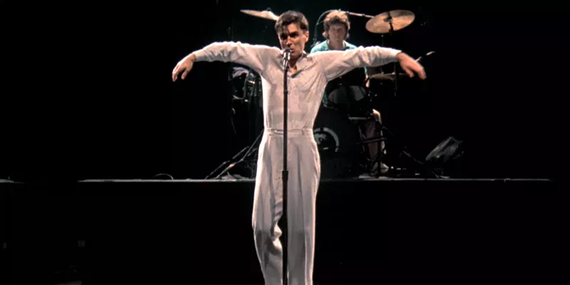 A man in a white suit with a tie and a white shirt is standing on stage with his arms stretched out to the sides. He is facing a drummer who is playing a drum set. The stage is lit with a spotlight, and the background is dark. | 'Stop Making Sense' actually makes total sense. | 2e03cfe6e8212fce5e34a940b9ba4b573ccaa8d1bc39956678a75b2dc754d5fa | 001229724386 | 0 | 0 | 48 | 7 | 0 | 0 | |